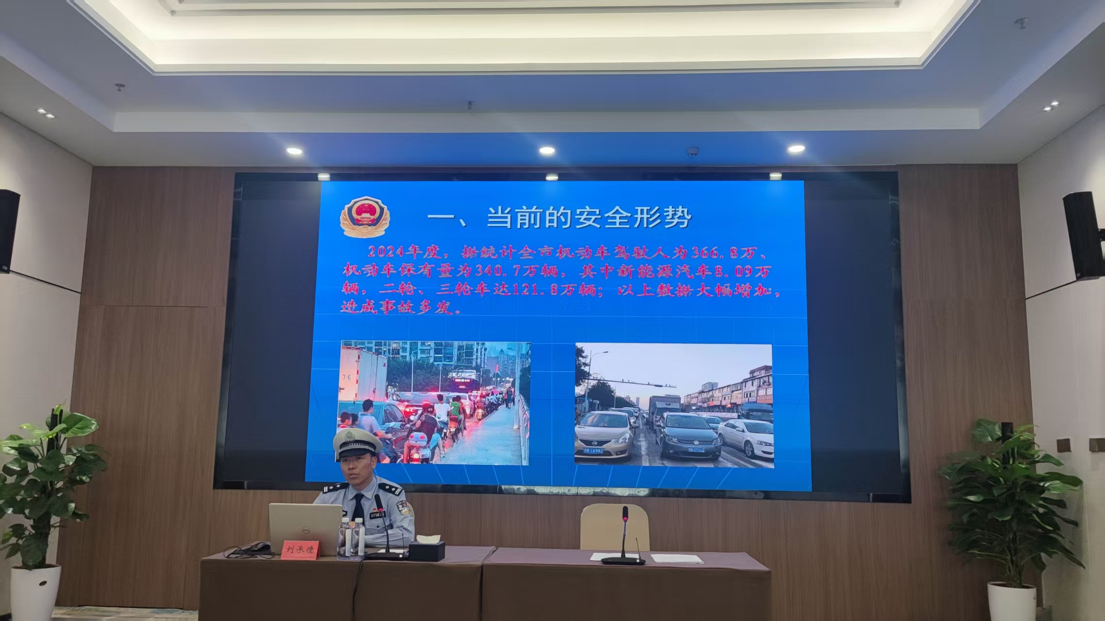 刘承德警官以“安全为基 生命至上”为主题,紧密结合赣州当地交通管理实际情况展开讲解。他先分析了当前赣州市的交通形势,指出随着车辆保有量不断增加,交通压力持续增大,市区交通安全管理面临诸多新挑战,让大家对身边的交通现状有了清晰认识。
