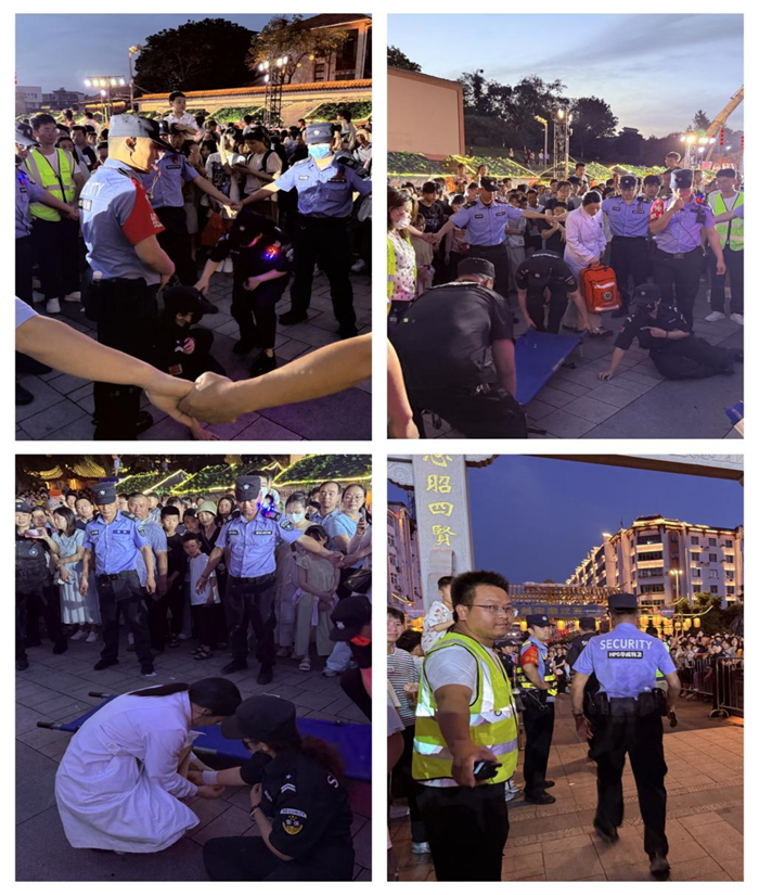 景区在飞天秀演出前,通过现场组织游客演练和讲解演示的方式开展了防踩踏应急救援演练。在军门楼广场模拟有游客突发晕倒受伤事故,景区随即启动应急预案,应急救援各小组成员接令后迅速集结,及时就位。其中,安保组手拉手形成人墙将事故区域与周围游客进行隔离,开辟了应急通道,医疗组迅速从应急通道进场实施救援,并将受伤游客抬入提前准备的救护车内,紧急送往医院治疗。演练期间,各小组严格按照预案进行分工、紧密配合开展救援处置。演练现场,还特别通过播报讲解的方式向游客演示了防踩踏的自救方法。不少游客纷纷表示,景区开展这样的现场演练活动,对游客是非常有益的一种宣传和培训,极大地提升了游客在人员密集场所的应急处置意识。同时,景区通过在大型活动前举行防踩踏应急救援演练,也进一步筑牢了工作人员的安全意识,提高了游客自救互救和工作人员应对紧急情况的处置能力。