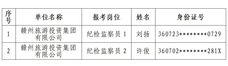 根据《“国资赣将”赣州旅游投资集团2025年第一批社会公开招聘公告》要求,经报名、资格审查、笔试、面试、体检、考察等程序,经研究,确定纪检监察员拟聘用人员如下: