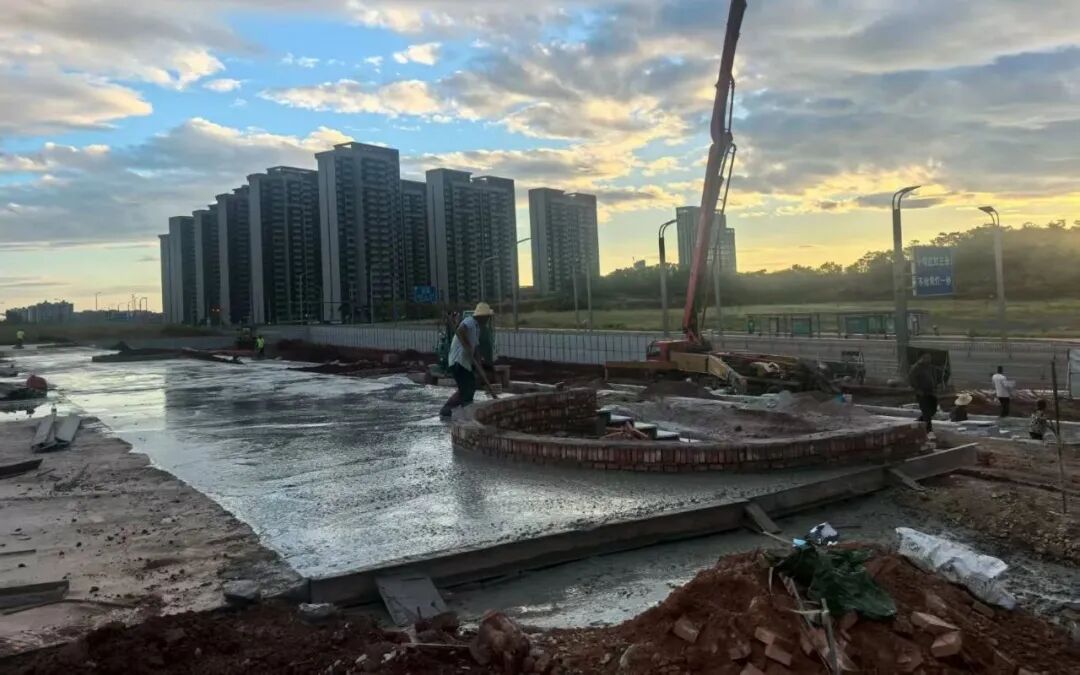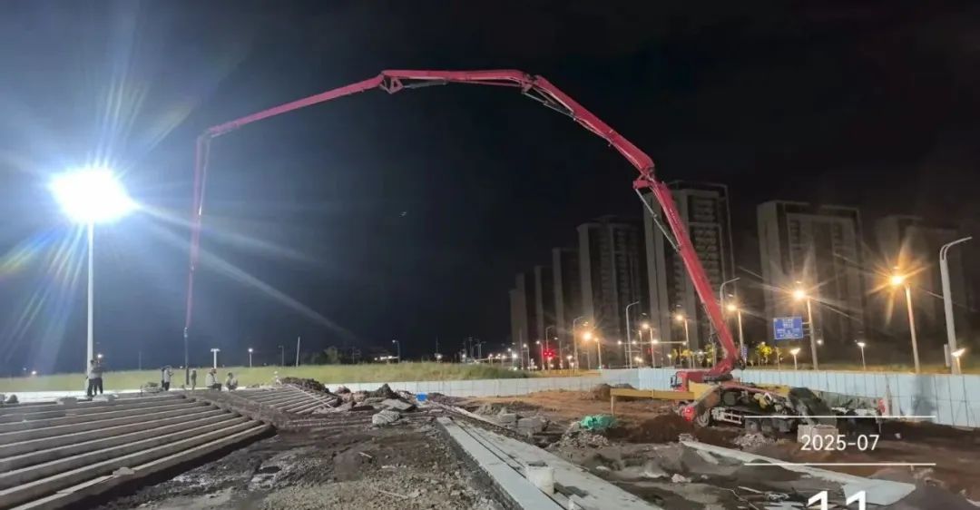 夏夜的赣州全民健身中心前广场改造项目现场灯火通明、机声隆隆,多台挖掘机和铲车在轰鸣声中紧张作业,多辆混凝土搅拌车与混凝土泵车(天泵)高效协同,十余辆运输车往来穿梭,建设工人们分成两班倒加紧施工。