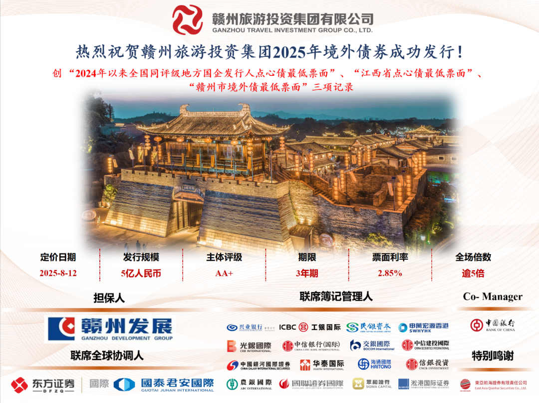 赣州旅游投资集团于2025年8月12日成功发行境外债券,规模5亿元人民币、票息2.85%。本次债券成功发行,创“2024年以来全国同评级地方国企发行人点心债最低票面”“江西省点心债最低票面”“赣州市境外债最低票面”三项记录。此次发行由东方证券(香港)和国泰君安国际担任全球协调人。