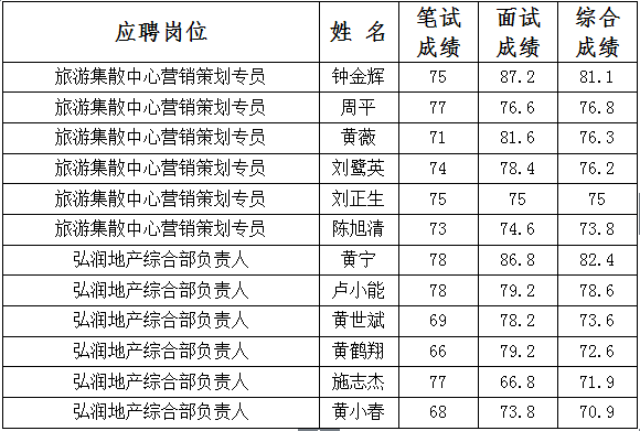 根据赣州旅游投资集团子公司招聘公告,现将入围旅游集散中心营销策划专员和弘润地产综合部负责人人员笔试、面试综合成绩排名公告如下: