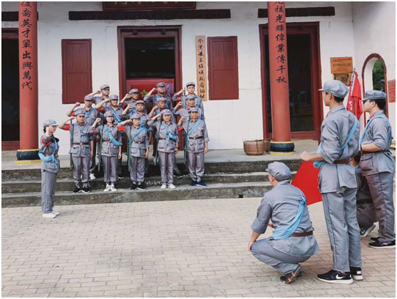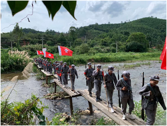 这条5公里的红军小道,刻印着厚重的历史脚印,承载着红军战士的钢铁意志,更有对长征精神的不息传承。大家怀着激动的心情,沿着红军足迹坚定向前。在行军途中,多人轮流负责扁担挑西瓜,感受后勤部的艰辛;五支队伍,穿山路、过登贤桥;唱红歌、分享红色故事;喝思源井水、参观登贤县苏维埃政府旧址,在袁氏祠堂前重温入党誓言。