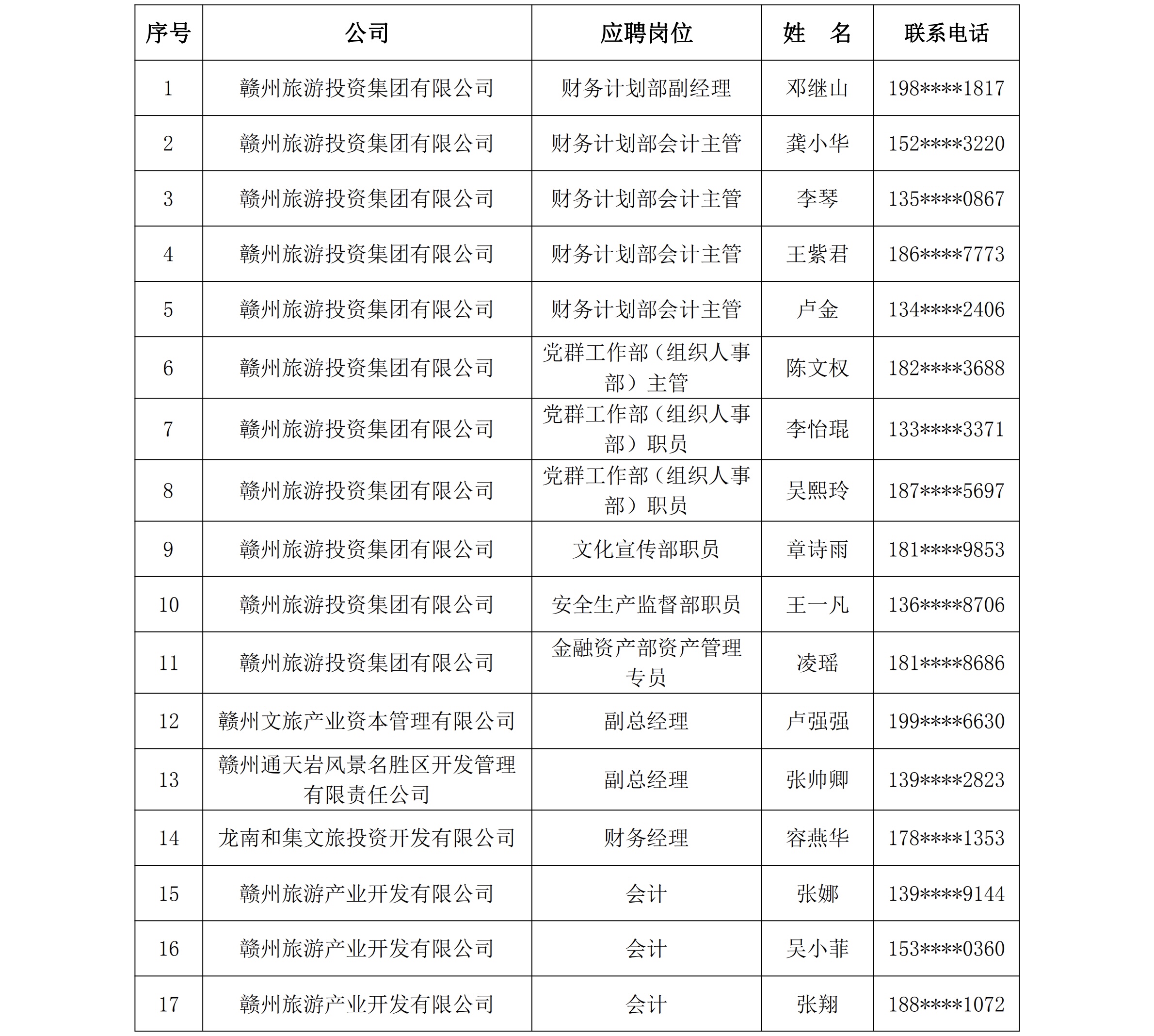 根据《赣州旅游投资集团有限公司招聘公告》要求,经报名、收集简历、资格审查、笔试、面试等程序,现将入闱体检、背景调查人员名单公示如下:
