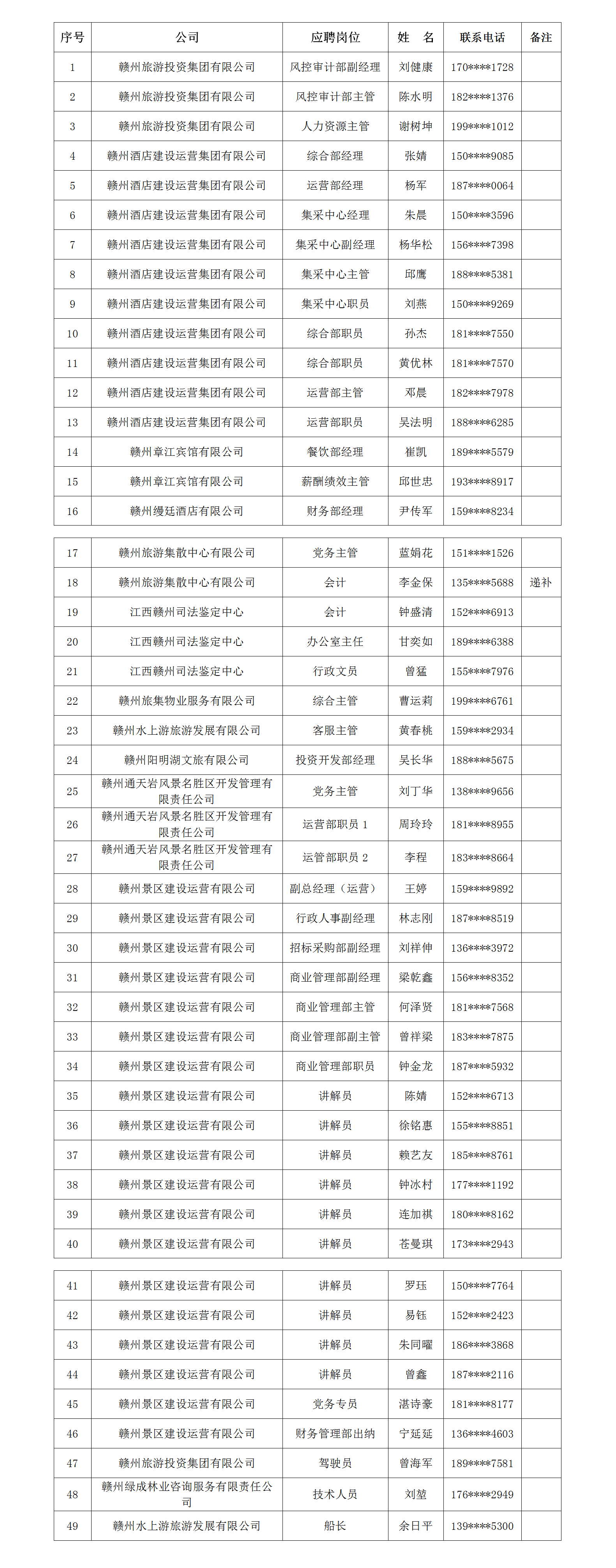 根据《赣州旅游投资集团有限公司招聘公告》要求,经报名、收集简历、资格审查、笔试(实操)、面试、体检、背景调查等程序,经研究,确定以下49人为拟聘用人选,公示如下: