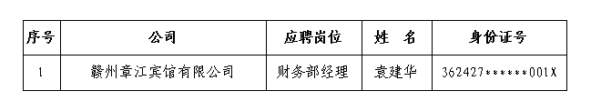 因章江宾馆财务部经理岗位拟聘用人选王芳海放弃录用资格,根据《赣州旅游投资集团有限公司招聘公告》要求,经研究,确定递补袁建华为章江宾馆财务部经理拟聘用人选,现公示如下: