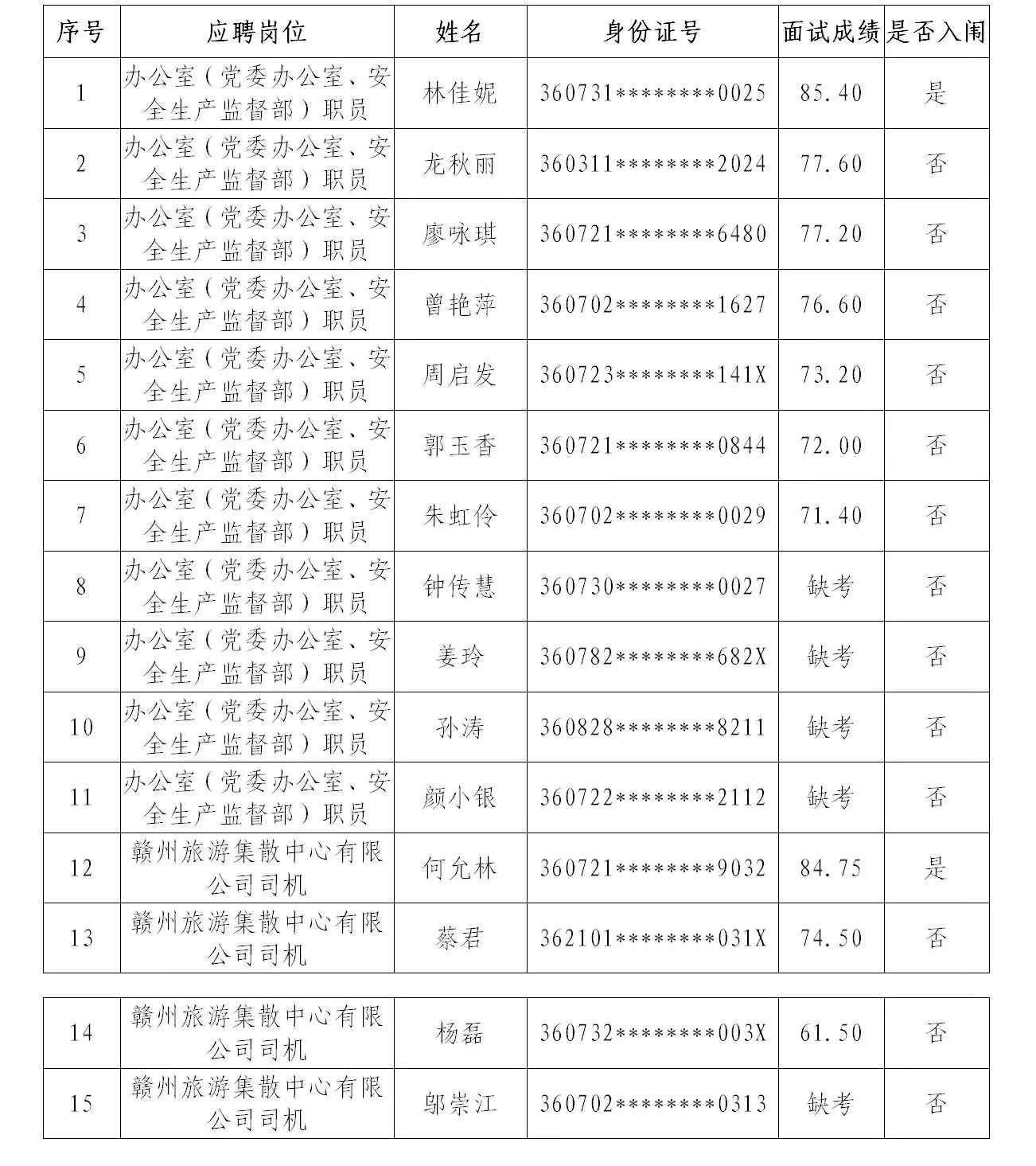 赣州旅游投资集团有限公司招聘劳务派遣制工作人员入闱体检、背景调查人员名单公示