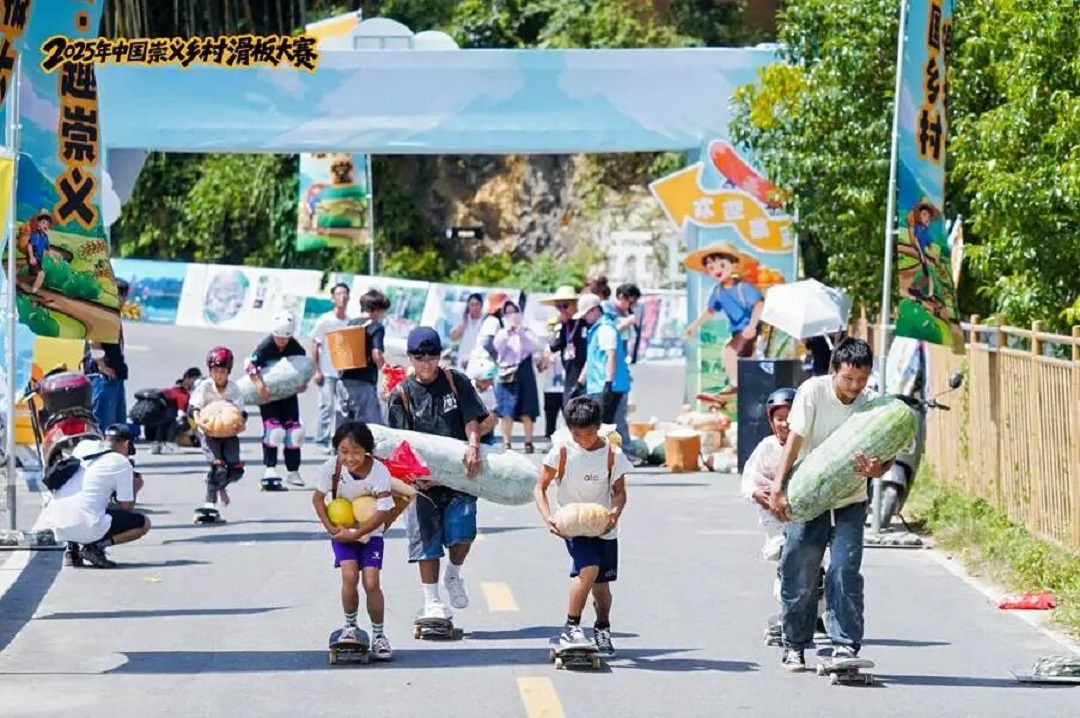 参赛选手金震宇说:“在村庄和田野里比赛真的太酷了!特别是运粮食的比赛,真的是太好玩了!我很喜欢这里的氛围,也非常享受这次比赛!”据悉,本次比赛赛程为期两天,采取团队积分排位赛玩法,各个队伍的队员在各项比赛中所得积分都将计入团队总积分。届时,各团队队员们将“各显神通”,决出前六名。观众肖华林说:“真没想到在崇义能看到这么有趣的滑板比赛!选手们从坡道上飞驰而下,背后就是乡村田野风光,那种动与静相结合的感觉特别奇妙,特别接地气,也特别有生命力。”